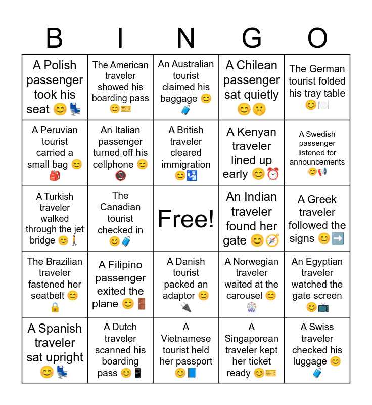 This bingo card has a free space and 33 words: The Korean traveler went to the gate early πβοΈ, A French passenger showed her passport ππ, The Canadian tourist checked in ππ§³, A Japanese businessman stowed his bag ππ, The Brazilian traveler fastened her seatbelt ππ, An Italian passenger turned off his cellphone ππ΅, The German tourist folded his tray table ππ½οΈ, A Spanish traveler sat upright ππΊ, The American traveler showed his boarding pass ππ«, A Thai student went through security ππ, A British traveler cleared immigration ππ, An Australian tourist claimed his baggage ππ§³, A Mexican passenger boarded the plane πβοΈ, A Chinese traveler cleared customs ππ¦, An Indian traveler found her gate ππ§, A Swedish passenger listened for announcements ππ’, A Dutch traveler scanned his boarding pass ππ±, A Turkish traveler walked through the jet bridge ππΆ, A Filipino passenger exited the plane ππͺ, A Norwegian traveler waited at the carousel ππ‘, A Danish tourist packed an adaptor ππ, A Malaysian traveler used an adaptor ππ, A Polish passenger took his seat ππΊ, A Greek traveler followed the signs πβ‘οΈ, A Vietnamese tourist held her passport ππ, A Swiss traveler checked his luggage ππ§³, A Chilean passenger sat quietly ππ€«, A Kenyan traveler lined up early πβ°, A Peruvian tourist carried a small bag ππ, An Egyptian traveler watched the gate screen ππΊ, A Belgian passenger adjusted his seat ππΊ, A Singaporean traveler kept her ticket ready ππ« and A New Zealand traveler walked to the gate ππΆβοΈ.