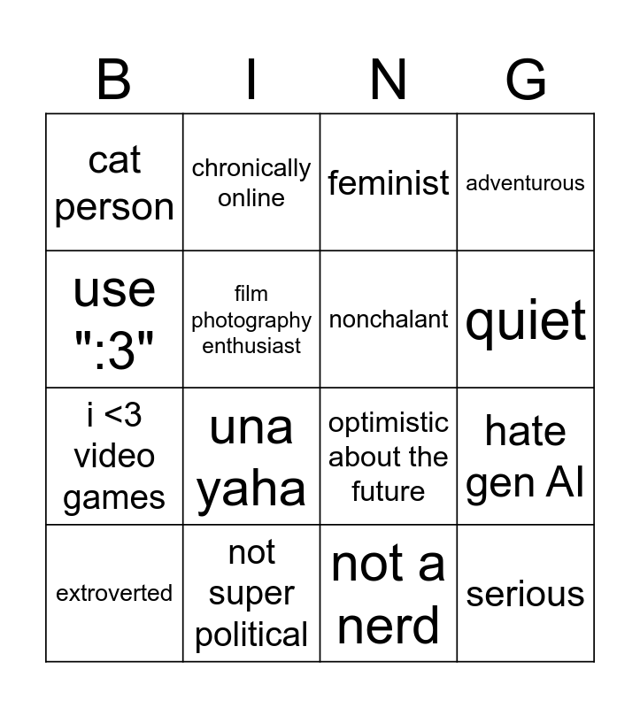 This bingo card has 16 words: not super political, hate gen AI, feminist, cat person, i <3 video games, chronically online, optimistic about the future, not a nerd, use ":3", film photography enthusiast, extroverted, adventurous, una yaha, quiet, nonchalant and serious.
