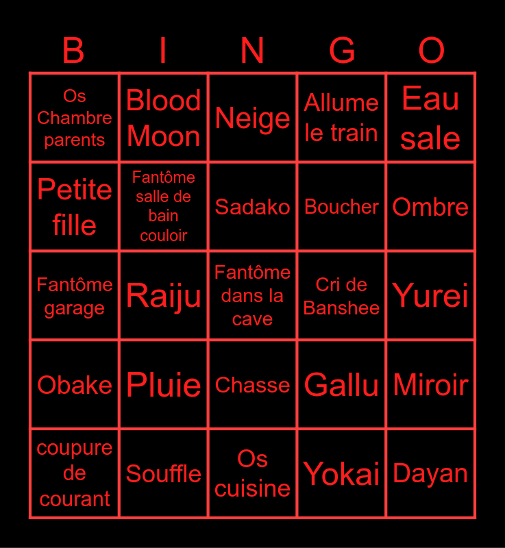This bingo card has 45 words: Deogen, Fantôme dans la cave, Ouvre le frigo, coupure de courant, Tarot, Yokai, Neige, D.O.T.S, Eau sale, Souffle, Allume le train, Cri de Banshee, Chasse, Pluie, Changement de salle, Os cuisine, EMF5, Fantôme garage, Ouija, Ombre, Blood Moon, Oni, Allume une lumière, Os Chambre parents, Banshee, Yurei, Demon, Goryo, Gallu, Obake, Empreintes, Miroir, Jette un objet, Orbes, Fantôme chambre enfant, Raiju, Revenant, Obambo, Dayan, Sadako, Petite fille, Boucher, vieille, Fantôme salle de bain couloir and Voiture qui klaxonne.