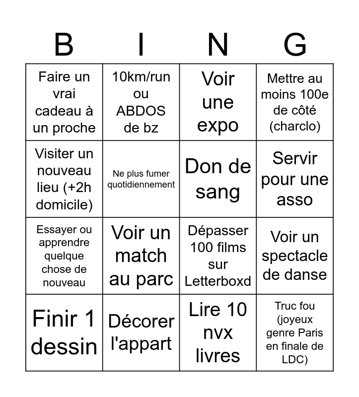 This bingo card has 16 words: Décorer l'appart, Voir un spectacle de danse, Voir une expo, Faire un vrai cadeau à un proche, Essayer ou apprendre quelque chose de nouveau, 10km/run ou ABDOS de bz, Dépasser 100 films sur Letterboxd, Lire 10 nvx livres, Visiter un nouveau lieu (+2h domicile), Ne plus fumer quotidiennement, Finir 1 dessin, Mettre au moins 100e de côté (charclo), Voir un match au parc, Servir pour une asso, Don de sang and Truc fou (joyeux genre Paris en finale de LDC).