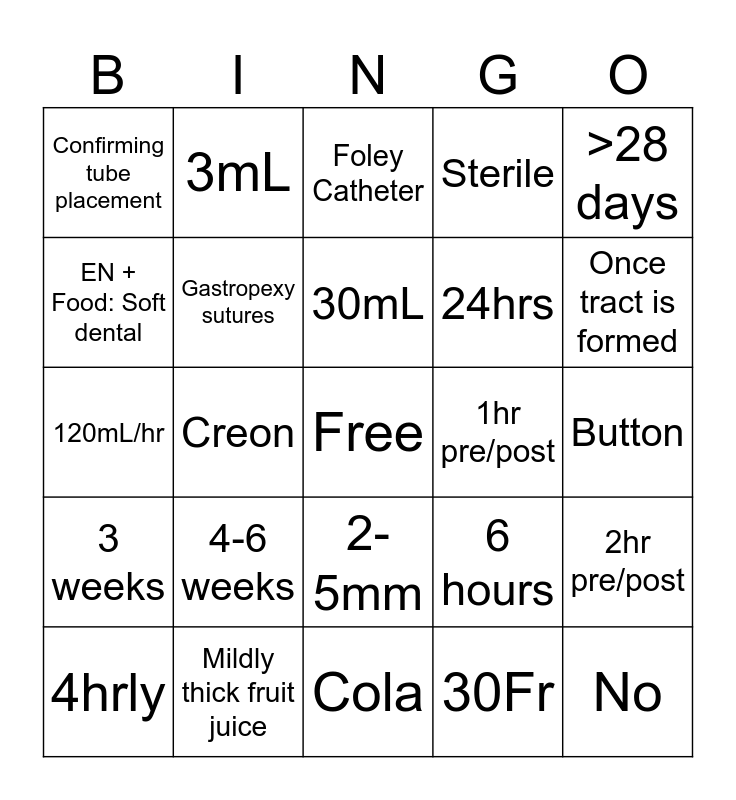 This bingo card has a free space and 24 words: 4-6 weeks, Mildly thick fruit juice, 30mL, 4hrly, >28 days, Confirming tube placement, EN + Food: Soft dental, 3mL, 1hr pre/post, 2-5mm, 24hrs, 120mL/hr, 6 hours, 2hr pre/post, Gastropexy sutures, 30Fr, Button, Foley Catheter, Once tract is formed, Creon, No, 3 weeks, Sterile and Cola.