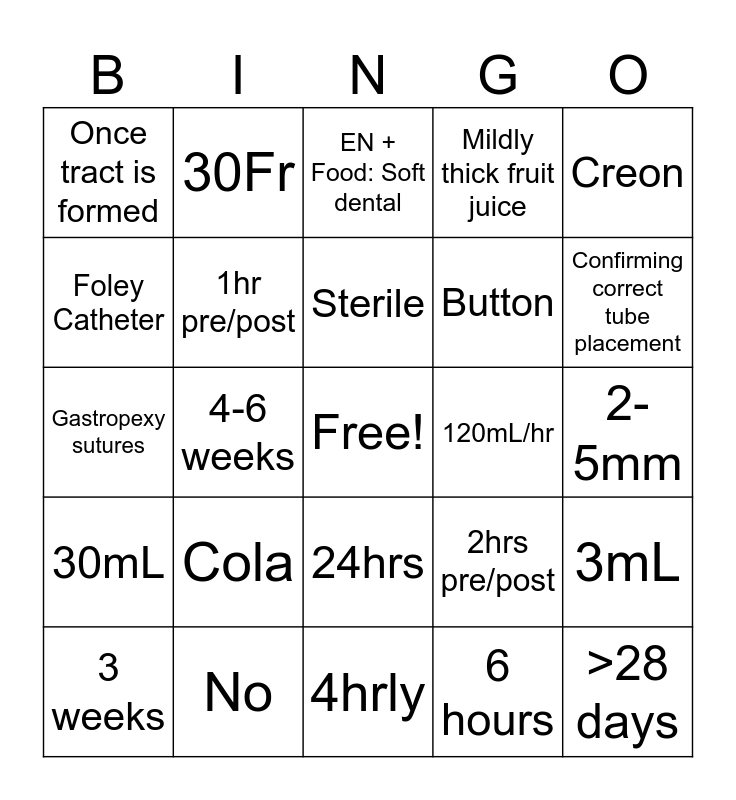 This bingo card has a free space and 24 words: Cola, No, Sterile, 3 weeks, Creon, Once tract is formed, Foley Catheter, 30Fr, 120mL/hr, 24hrs, Button, Gastropexy sutures, 2hrs pre/post, 3mL, 1hr pre/post, 6 hours, 2-5mm, EN + Food: Soft dental, Confirming correct tube placement, 4-6 weeks, >28 days, 30mL, Mildly thick fruit juice and 4hrly.