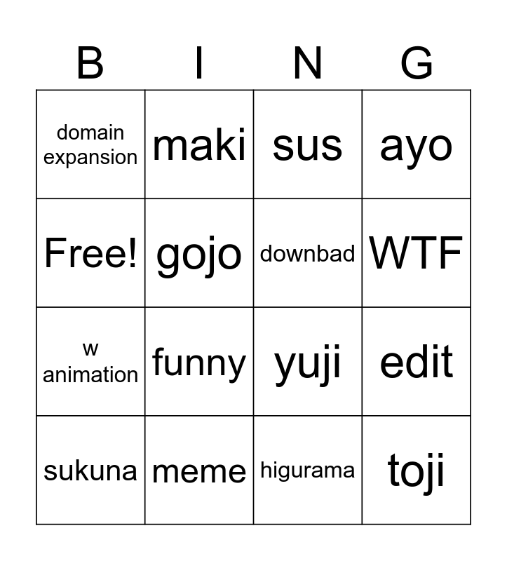 This bingo card has 16 words: meme, edit, sus, domain expansion, w animation, maki, yuji, higurama, Free!, gojo, sukuna, ayo, funny, WTF, downbad and toji.