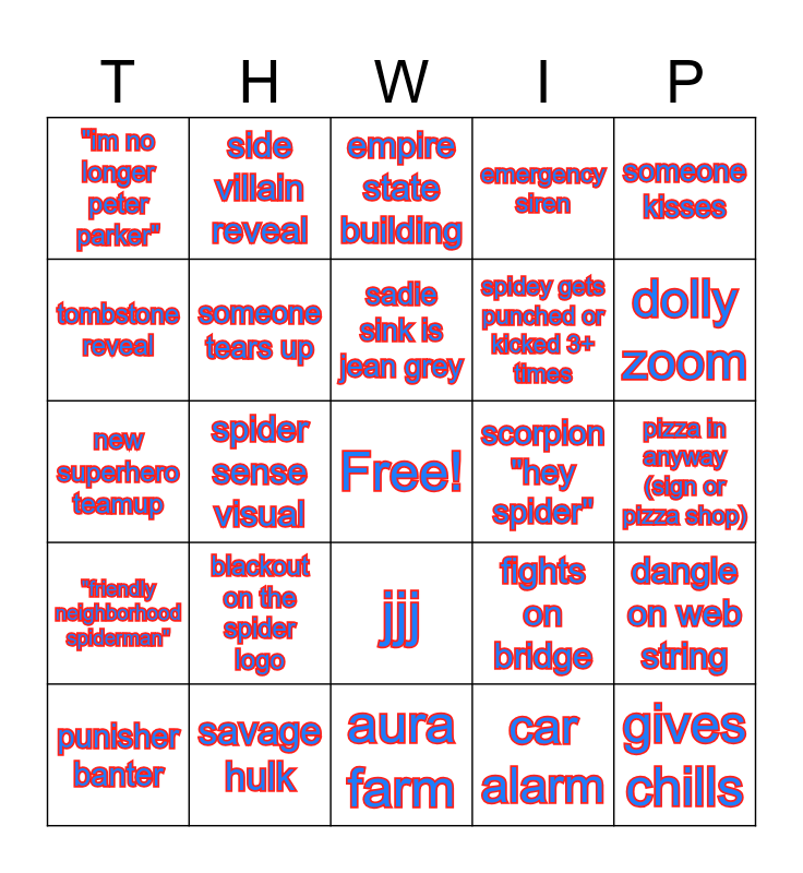 This bingo card has a free space and 24 words: blackout on the spider logo, savage hulk, sadie sink is jean grey, punisher banter, someone kisses, "im no longer peter parker", tombstone reveal, side villain reveal, scorpion "hey spider", jjj, spidey gets punched or kicked 3+ times, new superhero teamup, fights on bridge, dangle on web string, someone tears up, car alarm, pizza in anyway (sign or pizza shop), empire state building, dolly zoom, spider sense visual, gives chills, "friendly neighborhood spiderman", emergency siren and aura farm.