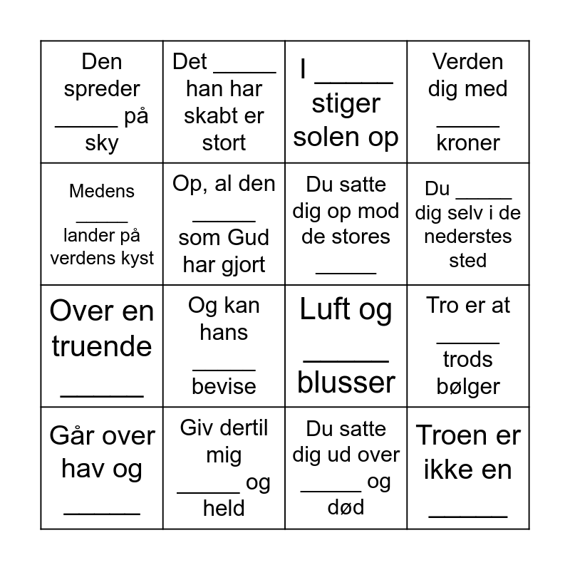 This bingo card has 20 words: Tro er at _____ trods bølger, Hvilken salig _____ skønt alt er tyst, I _____ stiger solen op, Se, nu ____ solen, Går over hav og _____, Medens _____ lander på verdens kyst, Giv dertil mig _____ og held, Den spreder _____ på sky, Over en truende _____, Det _____ han har skabt er stort, Og kan hans _____ bevise, Luft og _____ blusser, Op, al den _____ som Gud har gjort, Troen er ikke en _____, Du satte dig op mod de stores _____, Midt i et stormpisket _____, Du _____ dig selv i de nederstes sted, Verden dig med _____ kroner, Du satte dig ud over _____ og død and Hil dig _____ og forsoner.