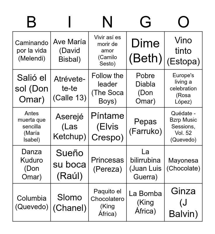 This bingo card has 99 words: Mi gran noche (Raphael), Libre (Nino Bravo), Amante Bandido (Miguel Bosé), Vivir así es morir de amor (Camilo Sesto), Chiquilla (Seguridad Social), Salta! (Tequila), Sufre mamón (Hombres G), Ni tú ni nadie (Alaska y Dinarama), Escuela de calor (Radio Futura), No puedo vivir sin ti (Los Ronaldos), La chica de ayer (Nacha Pop), A quién le importa (Alaska), Carolina (M-Clan), Princesas (Pereza), Zapatillas (El Canto del Loco), Caminando por la vida (Melendi), Ave María (David Bisbal), Bulería (David Bisbal), Torero (Chayanne), La camisa negra (Juanes), Cántame (María del Monte), El muerto vivo (Peret), Volare (Gipsy Kings), Bamboleo (Gipsy Kings), No rompas más (Raúl), Mayonesa (Chocolate), Follow the leader (The Soca Boys), La barbacoa (Georgie Dann), El chiringuito (Georgie Dann), Veo Veo (Teresa Rabal), Paquito el Chocolatero (King África), La Bomba (King África), Abanibi (El Chaval de la Peca), Macarena (Los del Río), Aserejé (Las Ketchup), Antes muerta que sencilla (María Isabel), Yo quiero bailar (Sonia y Selena), Dile que la quiero (David Civera), Que la detengan (David Civera), Sueño su boca (Raúl), Cuando tú vas (Chenoa), Europe's living a celebration (Rosa López), Dime (Beth), Slomo (Chanel), Zorra (Nebulossa), Nochentera (Vicco), Potra Salvaje (Isabel Aaiún), Flying Free (Pont Aeri), El Tiburón (Proyecto Uno), La ventanita (Sergio Vargas), Suavemente (Elvis Crespo), Píntame (Elvis Crespo), La bilirrubina (Juan Luis Guerra), Ojalá que llueva café (Juan Luis Guerra), Carnaval (Celia Cruz), La gota fría (Carlos Vives), Fruta fresca (Carlos Vives), Obsesión (Aventura), Procura (Chichi Peralta), Corazón Partío (Alejandro Sanz), Soldadito marinero (Fito & Fitipaldis), La flaca (Jarabe de Palo), Bonito (Jarabe de Palo), Depende (Jarabe de Palo), Como camarón (Estopa), Vino tinto (Estopa), Gasolina (Daddy Yankee), Lo que pasó, pasó (Daddy Yankee), Despacito (Luis Fonsi), Danza Kuduro (Don Omar), Dile (Don Omar), Pobre Diabla (Don Omar), Salió el sol (Don Omar), Rakata (Wisin & Yandel), Noche de sexo (Wisin & Yandel), Mayor que yo (Luny Tunes), Atrévete-te-te (Calle 13), Yo perreo sola (Bad Bunny), Tití me preguntó (Bad Bunny), Safaera (Bad Bunny), Pepas (Farruko), Provenza (Karol G), Tusa (Karol G), Bichota (Karol G), Todo de ti (Rauw Alejandro), Despechá (Rosalía), Malamente (Rosalía), Con altura (Rosalía), Quédate - Bzrp Music Sessions, Vol. 52 (Quevedo), Columbia (Quevedo), Tacones Rojos (Sebastian Yatra), Mi gente (J Balvin), Ginza (J Balvin), Bailando (Enrique Iglesias), El perdón (Nicky Jam), Travesuras (Nicky Jam), Felices los 4 (Maluma), Hawái (Maluma) and Limón y Sal (Julieta Venegas).
