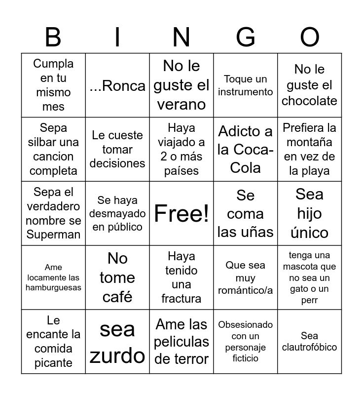 This bingo card has a free space and 24 words: No tome café, sea zurdo, Haya viajado a 2 o más países, Le encante la comida picante, No le guste el chocolate, Cumpla en tu mismo mes, Sepa silbar una cancion completa, ...Ronca, Se coma las uñas, Haya tenido una fractura, Adicto a la Coca-Cola, Sepa el verdadero nombre se Superman, Que sea muy romántico/a, tenga una mascota que no sea un gato o un perr, Le cueste tomar decisiones, Obsesionado con un personaje ficticio, Sea hijo único, No le guste el verano, Prefiera la montaña en vez de la playa, Se haya desmayado en público, Sea clautrofóbico, Ame locamente las hamburguesas, Toque un instrumento and Ame las peliculas de terror.