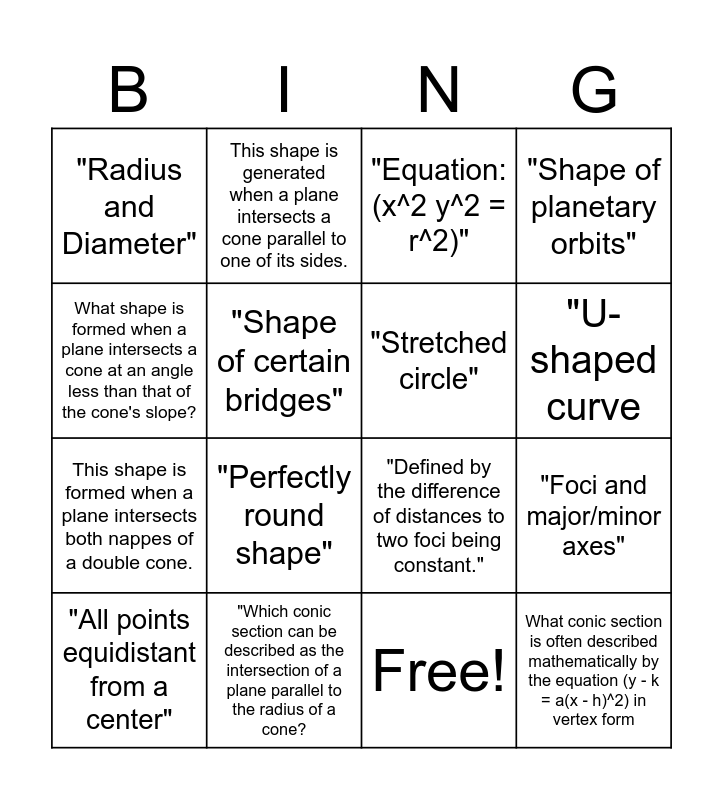 This bingo card has 17 words: Free!, "All points equidistant from a center", "Equation: (x^2 y^2 = r^2)", "Radius and Diameter", "Perfectly round shape", "Shape of planetary orbits", "Foci and major/minor axes", "Stretched circle", "U-shaped curve, "Shape of certain bridges", "Which conic section can be described as the intersection of a plane parallel to the radius of a cone?, "Defined by the difference of distances to two foci being constant.", What shape is formed when a plane intersects a cone at an angle less than that of the cone's slope?, This shape is generated when a plane intersects a cone parallel to one of its sides., This shape is formed when a plane intersects both nappes of a double cone., Eccentricity is 0 and What conic section is often described mathematically by the equation (y - k = a(x - h)^2) in vertex form.