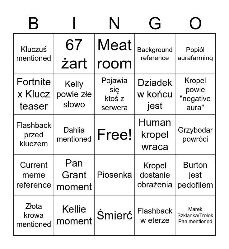 This bingo card has a free space and 24 words: Pan Grant moment, Kellie moment, Pojawia się ktoś z serwera, Złota krowa mentioned, Popiól aurafarming, Kluczuś mentioned, Fortnite x Klucz teaser, 67 żart, Human kropel wraca, Piosenka, Dziadek w końcu jest, Flashback przed kluczem, Kropel dostanie obrażenia, Burton jest pedofilem, Kelly powie złe słowo, Flashback w eterze, Grzybodar powróci, Meat room, Kropel powie "negative aura", Dahlia mentioned, Marek Szklanka/Trolek Pan mentioned, Current meme reference, Background reference and Śmierć.