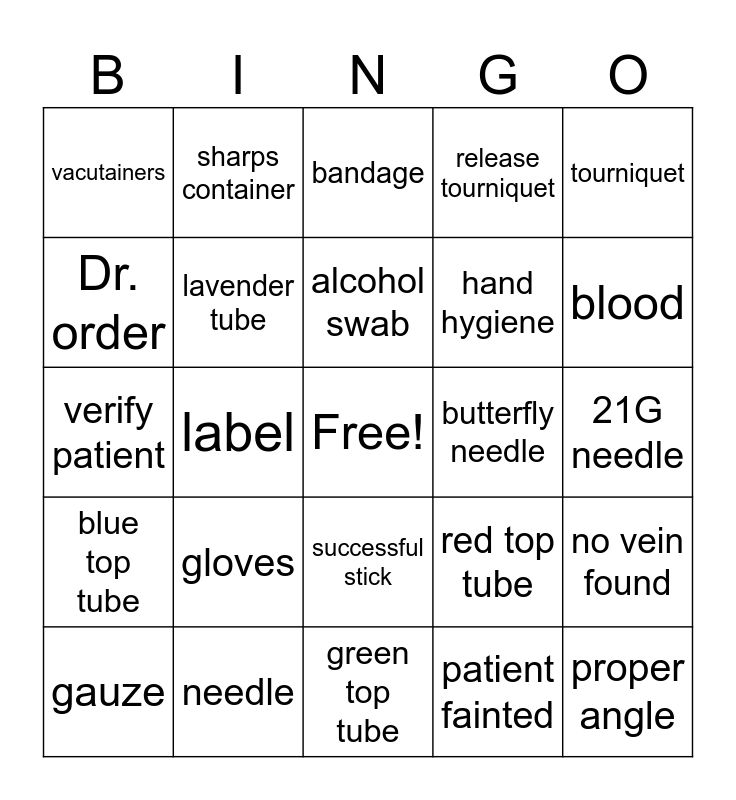 This bingo card has a free space and 24 words: gloves, needle, alcohol swab, gauze, tourniquet, vacutainers, Dr. order, sharps container, butterfly needle, successful stick, hand hygiene, verify patient, red top tube, no vein found, lavender tube, patient fainted, 21G needle, bandage, blood, label, proper angle, blue top tube, release tourniquet and green top tube.