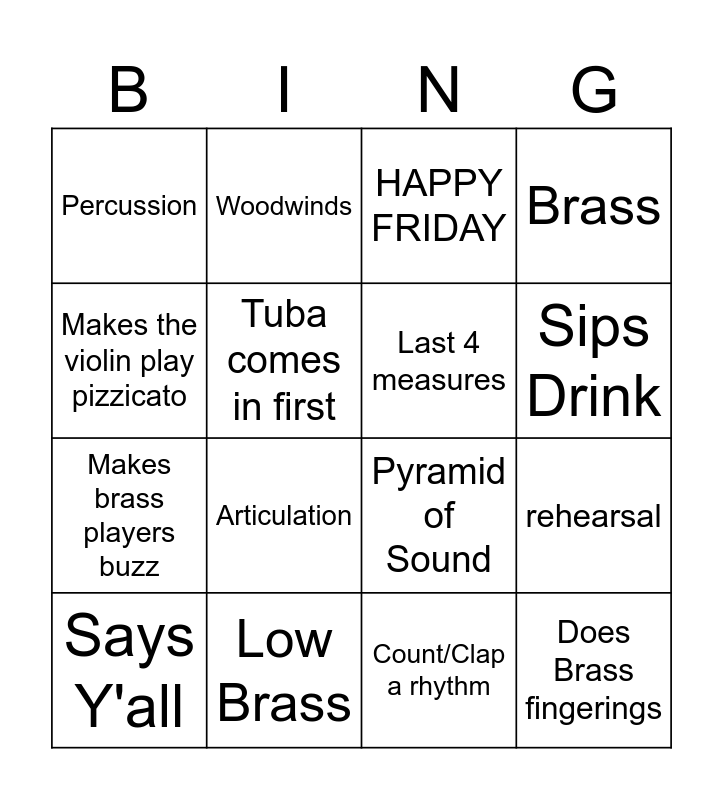 This bingo card has 16 words: Low Brass, rehearsal, HAPPY FRIDAY, Percussion, Makes brass players buzz, Woodwinds, Pyramid of Sound, Count/Clap a rhythm, Makes the violin play pizzicato, Tuba comes in first, Says Y'all, Brass, Articulation, Sips Drink, Last 4 measures and Does Brass fingerings.