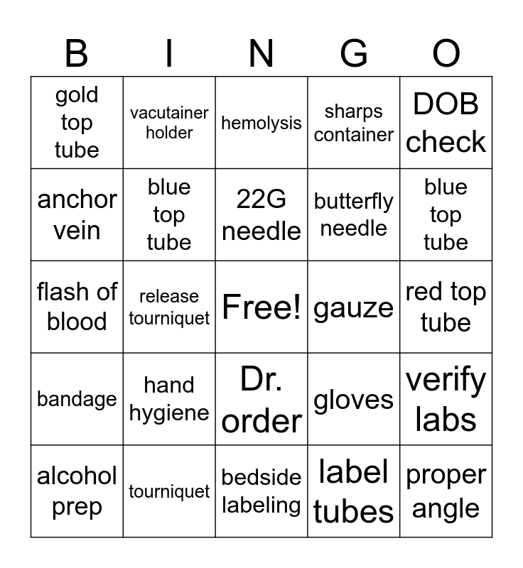 This bingo card has a free space and 24 words: hand hygiene, tourniquet, 22G needle, alcohol prep, DOB check, gold top tube, anchor vein, vacutainer holder, gauze, Dr. order, butterfly needle, flash of blood, gloves, verify labs, blue top tube, label tubes, red top tube, hemolysis, blue top tube, release tourniquet, proper angle, bandage, sharps container and bedside labeling.