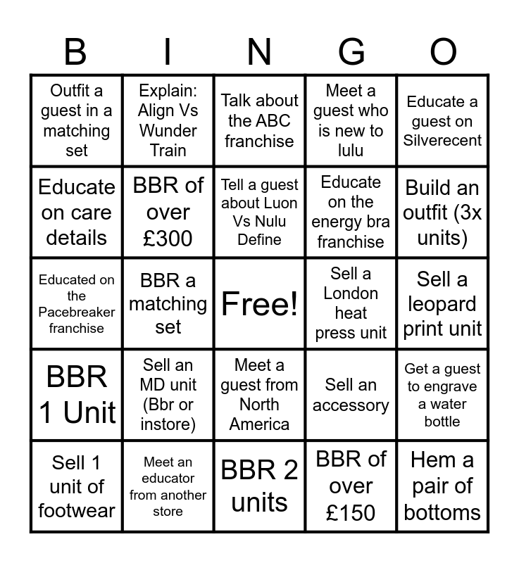 This bingo card has a free space and 25 words: BBR 1 Unit, Meet an educator from another store, BBR 2 units, BBR of over £150, Educate a guest on Silverecent, Outfit a guest in a matching set, Explain: Align Vs Wunder Train, Talk about the ABC franchise, Sell a London heat press unit, Get a guest to engrave a water bottle, Educate on care details, BBR of over £300, Set a guest up in a fitting room, Sell an accessory, Build an outfit (3x units), Sell 1 unit of footwear, BBR a matching set, Tell a guest about Luon Vs Nulu Define, Educate on the energy bra franchise, Sell a leopard print unit, Educated on the Pacebreaker franchise, Sell an MD unit (Bbr or instore), Meet a guest from North America, Meet a guest who is new to lulu and Hem a pair of bottoms.