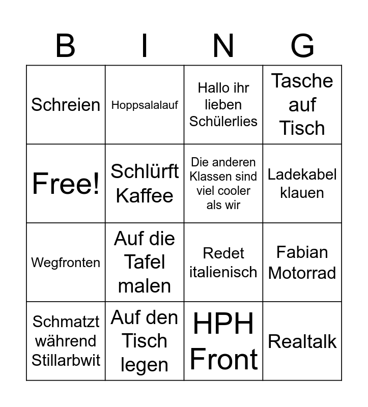 This bingo card has 16 words: Auf den Tisch legen, Fabian Motorrad, Hallo ihr lieben Schülerlies, Schreien, Wegfronten, Hoppsalalauf, Redet italienisch, HPH Front, Free!, Schlürft Kaffee, Schmatzt während Stillarbwit, Tasche auf Tisch, Auf die Tafel malen, Ladekabel klauen, Die anderen Klassen sind viel cooler als wir and Realtalk.