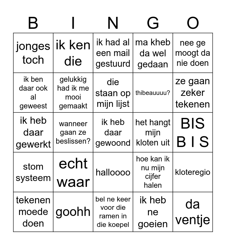 This bingo card has a free space and 24 words: echt waar, goohh, die staan op mijn lijst, tekenen moede doen, nee ge moogt da nie doen, jonges toch, ik ben daar ook al geweest, ik ken die, het hangt mijn kloten uit, halloooo, thibeauuuu?, ik heb daar gewerkt, hoe kan ik nu mijn cijfer halen, kloteregio, gelukkig had ik me mooi gemaakt, ik heb ne goeien, BIS B I S, ik had al een mail gestuurd, ze gaan zeker tekenen, wanneer gaan ze beslissen?, da ventje, stom systeem, ma kheb da wel gedaan and bel ne keer voor die ramen in die koepel.