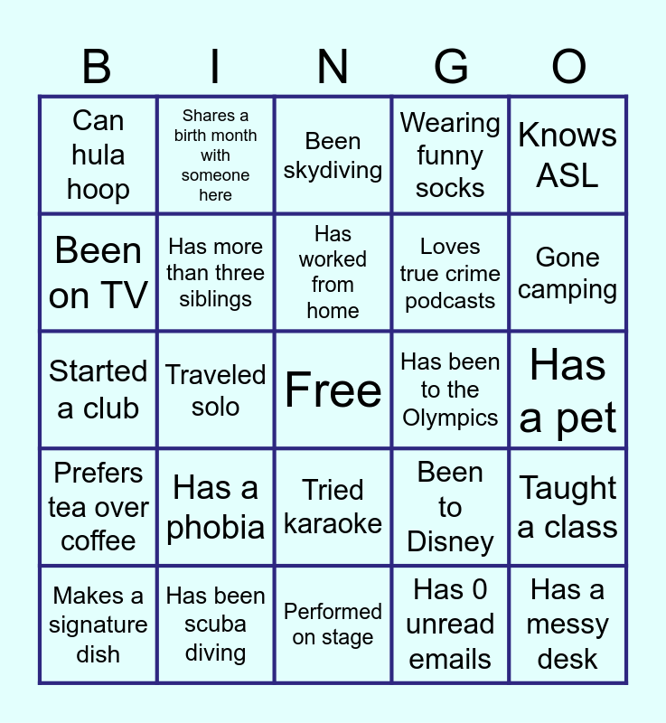 This bingo card has a free space and 162 words: Acted in a play, Appeared in a movie, Attended a concert, Attended high school reunion, Been a vegetarian, Been in a parade, Been in a wedding party, Been on a blind date, Been on a cruise, Been on a helicopter ride, Been on TV, Been promoted, Been skydiving, Been to a music festival, Been to Disney, Belongs to a club, Binge-watched a whole show in one weekend, Brews beer, Broken a bone, Burned dinner badly, Can bake from scratch, Can build something with tools, Can change a tire, Can do a cartwheel, Can do basic car repairs, Can drive stick shift, Can hula hoop, Can quote a movie word for word, Can whistle loudly, Changed majors in college, Climbed a mountain, Collects something, Completed a puzzle over 1,000 pieces, Does stand up comedy, Does Yoga, Double-jointed, Drinks coffee every day, Dyed their hair, Eaten something unusual, Gardens, Gone camping, Gone scuba diving, Gone snorkeling, Gone viral, Gone white water rafting, Gone ziplining, Good at escape rooms, Gotten a speeding ticket, Gotten lost in their own city, Grown their own vegetables, Had a job they hated, Had a job they loved, Had a summer job as a teen, Had a surprise party, Had braces, Has 0 unread emails, Has a cat, Has a dog, Has a favorite sports team, Has a hidden talent, Has a messy desk, Has a nickname, Has a pet, Has a phobia, Has a scar, Has a sweet tooth, Has a tattoo, Has an exotic pet, Has been in a hot air balloon, Has been scuba diving, Has been skydiving, Has been to the Olympics, Has more than three siblings, Has moved more than three times, Has never broken a bone, Has officiated a wedding, Has run a 5K, Has taken a cruise, Has taken a dance class, Has worked from home, Hates chocolate, Hates cooking, Hosted a party, In a sports league, Is a twin, Is afraid of spiders, Is an only child, Is good at trivia, Is left-handed, Knows ASL, Knows how to juggle, Knows how to sew, Knows how to surf, Knows martial arts, Knows the whole periodic table, Likes pineapple on pizza, Listens to podcasts, Lived in another country, Lived in another state, Loves board games, Loves karaoke, Loves roller coasters, Loves spicy food, Loves to cook, Loves true crime podcasts, Makes a signature dish, Mentored someone, Met someone famous, Missed a flight, Never flown on an airplane, Never learned to ride a bike, Never learned to swim, Only child, Orders the same thing every time at a restaurant, Owns a boat, Owns a gaming computer, Owns a vacation house, Owns same car brand as you, Performed on stage, Played/Plays an instrument, Plays video games, Prefers tea over coffee, Proposed to spouse in public, Ran in a marathon, Read more than ten books in a year, Reads newspapers, Received an award, Ridden a horse, Same birth month as you, Screams during scary movies, Seen the ocean in person, Shares a birth month with someone here, Speaks another language, Spelling bee champ, Started a club, Stayed up all night, Still has their childhood stuffed animal, Swam with dolphins, Taken a road trip over 5 hours, Taught a class, Thrown a surprise party, Took dance lessons, Traveled in the last year, Traveled solo, Traveled to another country, Tried food from another country, Tried karaoke, Tried sushi, Uses a paper planner, Visited a national park, Visited more than 10 states, Wakes up before 6am regularly, Was lead in a play, Wearing funny socks, Wears contacts, Won a contest, Won a race, Won an eating competition, Won at a casino, Worked in food service, Worked in retail and Works in a different field than their degree.