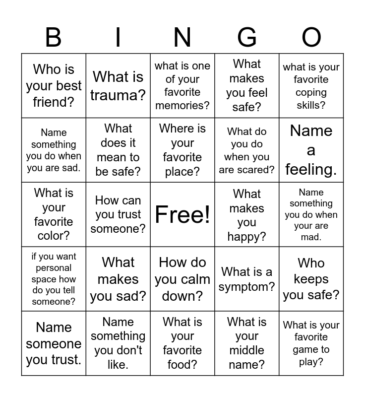 This bingo card has a free space and 24 words: What makes you sad?, Name something you don't like., Where is your favorite place?, Name someone you trust., what is your favorite coping skills?, Who is your best friend?, Name something you do when you are sad., What is trauma?, What makes you happy?, How do you calm down?, What do you do when you are scared?, What is your favorite color?, What is a symptom?, Who keeps you safe?, What does it mean to be safe?, What is your middle name?, Name something you do when your are mad., what is one of your favorite memories?, Name a feeling., How can you trust someone?, What is your favorite game to play?, if you want personal space how do you tell someone?, What makes you feel safe? and What is your favorite food?.