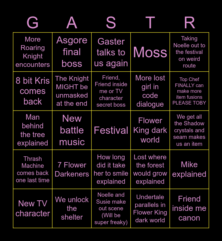 This bingo card has a free space and 24 words: 7 Flower Darkeners, We unlock the shelter, Friend, Friend inside me or TV character secret boss, New TV character, Taking Noelle out to the festival on weird route, More Roaring Knight encounters, 8 bit Kris comes back, Asgore final boss, Flower King dark world, How long did it take her to smile explained, More lost girl in code dialogue, Man behind the tree explained, Lost where the forest would grow explained, Mike explained, The Knight MIGHT be unmasked at the end, Undertale parallels in Flower King dark world, We get all the Shadow crystals and seam makes us an item, Gaster talks to us again, Top Chef FINALLY can make more item fusions PLEASE TOBY, New battle music, Friend inside me canon, Thrash Machine comes back one last time, Moss and Noelle and Susie make out scene (Will be super freaky).