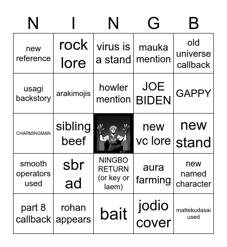 This bingo card has a free space and 24 words: sbr ad, rohan appears, howler mention, part 8 callback, old universe callback, new reference, usagi backstory, rock lore, new vc lore, NINGBO RETURN (or key or laem), JOE BIDEN, CHARMINGMAN, aura farming, new named character, arakimojis, jodio cover, new stand, virus is a stand, GAPPY, sibling beef, mattekudasai used, smooth operators used, mauka mention and bait.