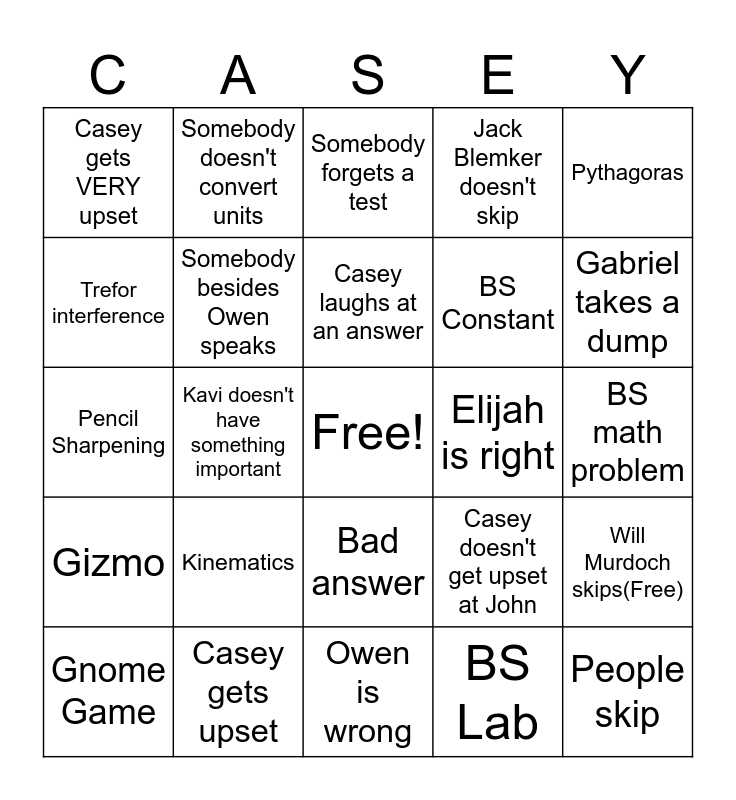 This bingo card has a free space and 30 words: Casey gets upset, Someone doesn't do the problem set, Kavi doesn't have something important, Warm up problem takes 30 mins, Casey gets VERY upset, Somebody forgets a test, Somebody besides Owen speaks, Bad answer, Elijah is right, Owen is wrong, BS math problem, People skip, BS Lab, Faking the lab results, Gabriel takes a dump, Jack/Elijah design bikes, Casey doesn't get upset at John, Gizmo, Kinematics, Pythagoras, Pencil Sharpening, Elijah doesn't pay attention, Somebody doesn't convert units, BS Constant, Trefor interference, Jack Blemker doesn't skip, Will Murdoch skips(Free), Gnome Game, Casey laughs at an answer and The person to your left doesn't pay attention.