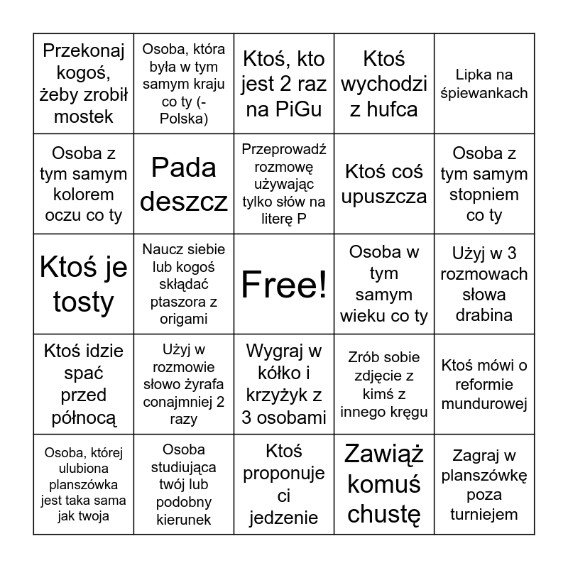 This bingo card has a free space and 24 words: Użyj w rozmowie słowo żyrafa conajmniej 2 razy, Osoba studiująca twój lub podobny kierunek, Przeprowadź rozmowę używając tylko słów na literę P, Osoba, której ulubiona planszówka jest taka sama jak twoja, Lipka na śpiewankach, Przekonaj kogoś, żeby zrobił mostek, Osoba z tym samym kolorem oczu co ty, Osoba, która była w tym samym kraju co ty (- Polska), Osoba w tym samym wieku co ty, Wygraj w kółko i krzyżyk z 3 osobami, Ktoś coś upuszcza, Ktoś je tosty, Zrób sobie zdjęcie z kimś z innego kręgu, Ktoś mówi o reformie mundurowej, Pada deszcz, Zawiąż komuś chustę, Użyj w 3 rozmowach słowa drabina, Ktoś, kto jest 2 raz na PiGu, Osoba z tym samym stopniem co ty, Naucz siebie lub kogoś skłądać ptaszora z origami, Zagraj w planszówkę poza turniejem, Ktoś idzie spać przed północą, Ktoś wychodzi z hufca and Ktoś proponuje ci jedzenie.