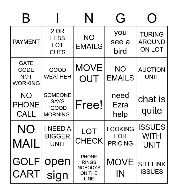 This bingo card has a free space and 24 words: I NEED A BIGGER UNIT, open sign, MOVE OUT, GOLF CART, TURING AROUND ON LOT, PAYMENT, GATE CODE NOT WORKING, 2 OR LESS LOT CUTS, need Ezra help, LOT CHECK, NO EMAILS, NO PHONE CALL, LOOKING FOR PRICING, ISSUES WITH UNIT, GOOD WEATHER, MOVE IN, chat is quite, NO EMAILS, AUCTION UNIT, SOMEONE SAYS "GOOD MORNING", SITELINK ISSUES, NO MAIL, you see a bird and PHONE RINGS NOBODYS ON THE LINE.
