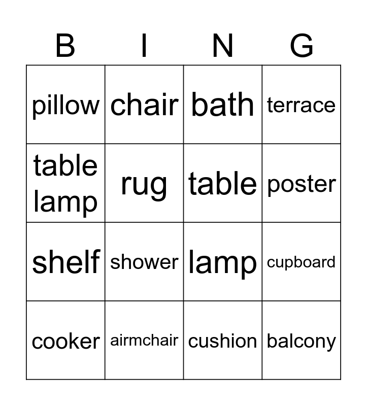 This bingo card has 24 words: Free!, picture, poster, desk, table lamp, pillow, rug, chair, airmchair, cookcase, shelf, lamp, bed, sink, table, wardrobe, cushion, bath, shower, cupboard, cooker, balcony, terrace and toilet.
