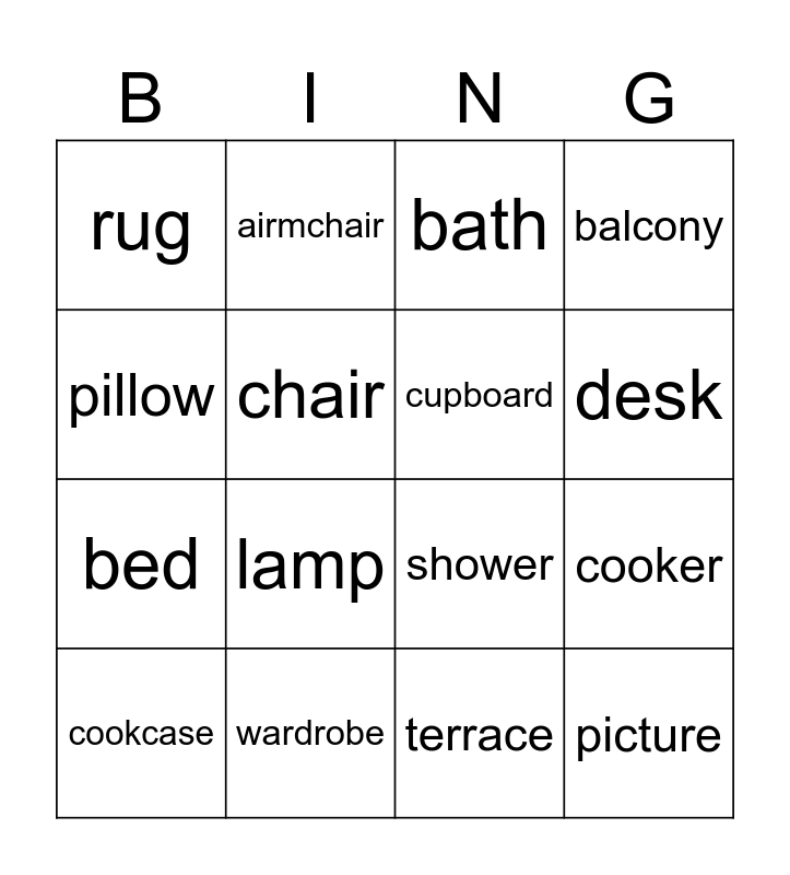 This bingo card has 23 words: picture, poster, desk, table lamp, pillow, rug, chair, airmchair, cookcase, shelf, lamp, bed, sink, table, wardrobe, cushion, bath, shower, cupboard, cooker, balcony, terrace and toilet.