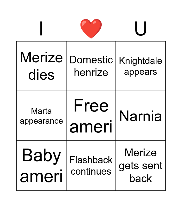 This bingo card has a free space and 8 words: Narnia, Knightdale appears, Domestic henrize, Baby ameri, Merize dies, Merize gets sent back, Marta appearance and Flashback continues.