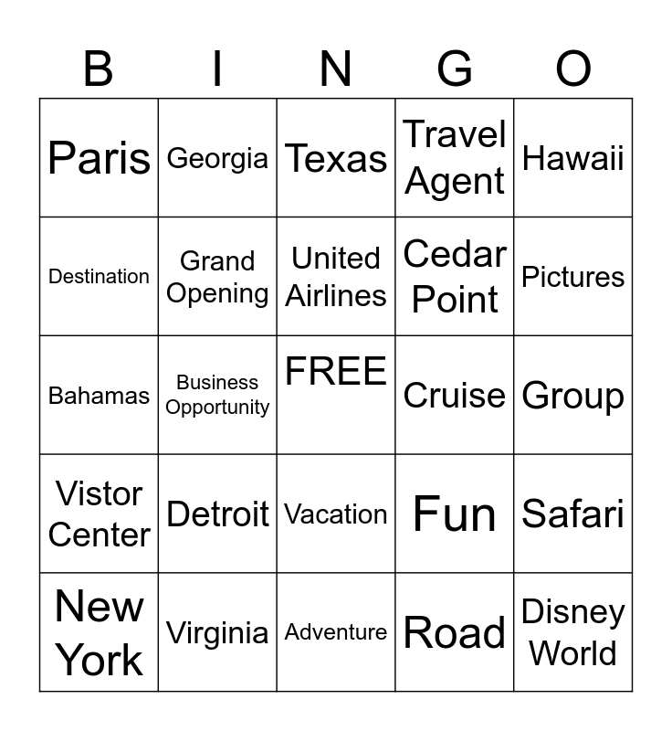 This bingo card has a free space and 24 words: Detroit, Virginia, United Airlines, New York, Hawaii, Paris, Destination, Georgia, Cruise, Vacation, Cedar Point, Bahamas, Fun, Safari, Grand Opening, Road, Group, Texas, Pictures, Business Opportunity, Disney World, Vistor Center, Travel Agent and Adventure.