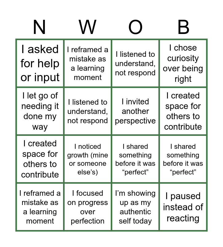 This bingo card has 32 words: I’m showing up as my authentic self self today, I asked a question instead of jumping to a conclusion, I shared something before it was “perfect”, I trusted someone without stepping in, I paused instead of reacting, I invited another perspective, I let go of needing it done my way, I checked an assumption before acting, I reframed a mistake as a learning moment, I chose curiosity over being right, I created space for others to contribute, I listened to understand, not respond, I welcomed input that challenged my thinking, I let something move forward without over-editing, I focused on progress over perfection, I noticed growth (mine or someone else’s), I asked a question instead of jumping to a conclusion, I shared something before it was “perfect”, I trusted someone without stepping in, I paused instead of reacting, I invited another perspective, I let go of needing it done my way, I’m showing up as my authentic self today, I checked an assumption before acting, I reframed a mistake as a learning moment, I chose curiosity over being right, I created space for others to contribute, I listened to understand, not respond, I asked for help or input, I let something move forward without over-editing, I focused on progress over perfection and I noticed growth (mine or someone else’s).