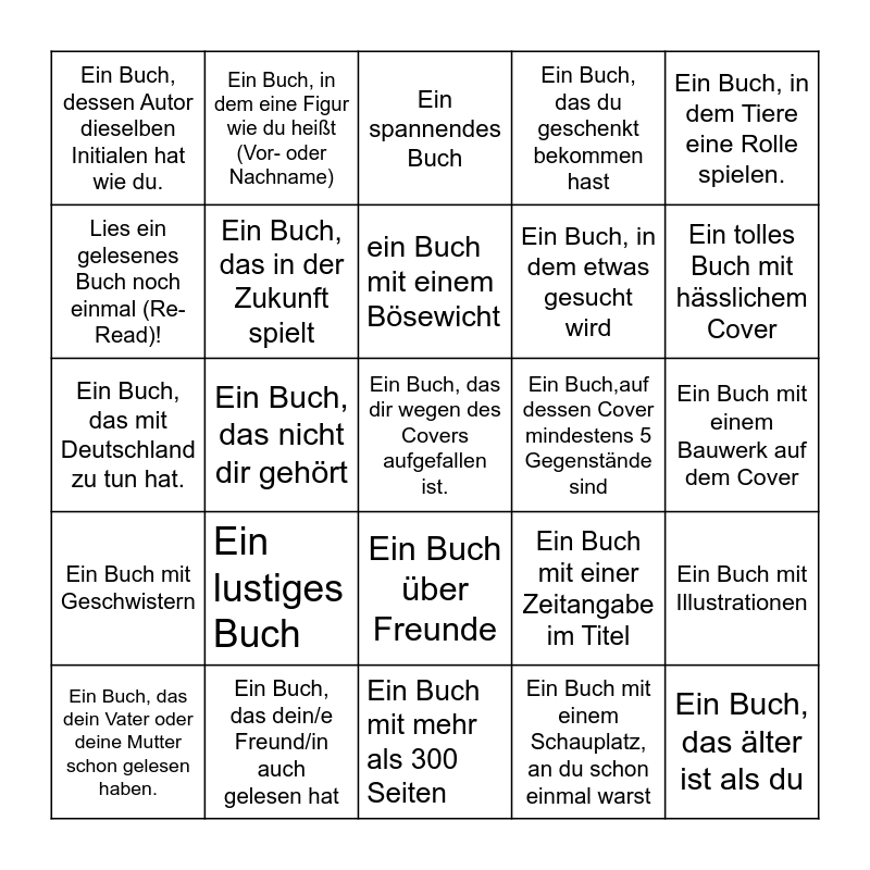 This bingo card has 25 words: Ein lustiges Buch, Ein Buch mit mehr als 300 Seiten, ein Buch mit einem Bösewicht, Ein Buch, das dein Vater oder deine Mutter schon gelesen haben., Ein Buch, in dem Tiere eine Rolle spielen., Ein Buch, dessen Autor dieselben Initialen hat wie du., Lies ein gelesenes Buch noch einmal (Re-Read)!, Ein Buch, in dem eine Figur wie du heißt (Vor- oder Nachname), Ein Buch,auf dessen Cover mindestens 5 Gegenstände sind, Ein Buch über Freunde, Ein Buch, in dem etwas gesucht wird, Ein Buch, das mit Deutschland zu tun hat., Ein Buch mit einer Zeitangabe im Titel, Ein Buch mit Illustrationen, Ein Buch, das in der Zukunft spielt, Ein Buch, das älter ist als du, Ein Buch mit einem Bauwerk auf dem Cover, Ein spannendes Buch, Ein tolles Buch mit hässlichem Cover, Ein Buch, das nicht dir gehört, Ein Buch, das dir wegen des Covers aufgefallen ist., Ein Buch, das dein/e Freund/in auch gelesen hat, Ein Buch mit Geschwistern, Ein Buch, das du geschenkt bekommen hast and Ein Buch mit einem Schauplatz, an du schon einmal warst.