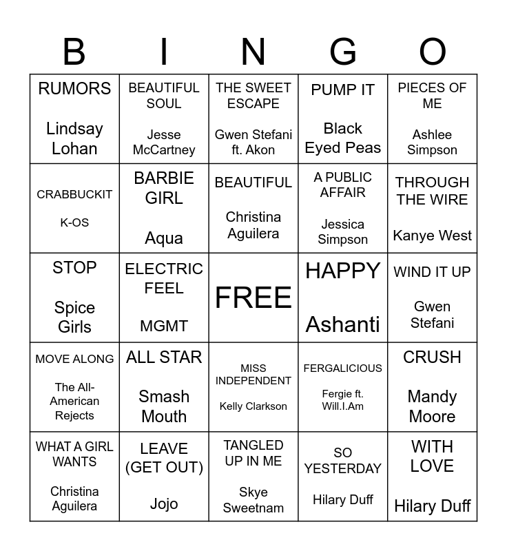 This bingo card has a free space and 26 words: MISS INDEPENDENT Kelly Clarkson, SO YESTERDAY Hilary Duff, BEAUTIFUL Christina Aguilera, LEAVE (GET OUT) Jojo, PIECES OF ME Ashlee Simpson, RUMORS Lindsay Lohan, CRABBUCKIT K-OS, BEAUTIFUL SOUL Jesse McCartney, WIND IT UP Gwen Stefani, FERGALICIOUS Fergie ft. Will.I.Am, A PUBLIC AFFAIR Jessica Simpson, STOP Spice Girls, CRUSH Mandy Moore, WHAT A GIRL WANTS Christina Aguilera, ELECTRIC FEEL MGMT, CLUMSY Fergie, PUMP IT Black Eyed Peas, MOVE ALONG The All-American Rejects, THE SWEET ESCAPE Gwen Stefani ft. Akon, WITH LOVE Hilary Duff, THROUGH THE WIRE Kanye West, TANGLED UP IN ME Skye Sweetnam, HAPPY Ashanti, ALL STAR Smash Mouth, BARBIE GIRL Aqua and PON DE REPLAY Rihanna.