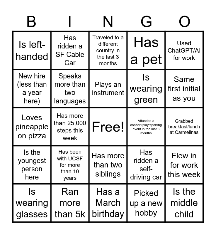 This bingo card has a free space and 24 words: Has been with UCSF for more than 10 years, Ran more than 5k, Plays an instrument, Is wearing glasses, Used ChatGPT/AI for work, Is left-handed, New hire (less than a year here), Has ridden a SF Cable Car, Attended a concert/play/sporting event in the last 3 months, Has more than two siblings, Is wearing green, Loves pineapple on pizza, Has ridden a self-driving car, Flew in for work this week, Speaks more than two languages, Picked up a new hobby, Grabbed breakfast/lunch at Carmelinas, Traveled to a different country in the last 3 months, Same first initial as you, Has more than 25,000 steps this week, Is the middle child, Is the youngest person here, Has a pet and Has a March birthday.