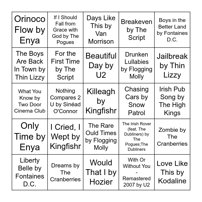 This bingo card has a free space and 28 words: Zombie by The Cranberries, Too Sweet by Hozier, Drunken Lullabies by Flogging Molly, With Or Without You - Remastered 2007 by U2, The Boys Are Back In Town by Thin Lizzy, Days Like This by Van Morrison, If I Should Fall from Grace with God by The Pogues, Only Time by Enya, Chasing Cars by Snow Patrol, Liberty Belle by Fontaines D.C., What You Know by Two Door Cinema Club, Breakeven by The Script, Dreams by The Cranberries, Would That I by Hozier, Jailbreak by Thin Lizzy, Into the Mystic - 2013 Remaster by Van Morrison, I Cried, I Wept by Kingfishr, For the First Time by The Script, Beautiful Day by U2, The Rare Ould Times by Flogging Molly, Orinoco Flow by Enya, Run by Snow Patrol, Love Like This by Kodaline, Nothing Compares 2 U by Sinéad O'Connor, Irish Pub Song by The High Kings, The Irish Rover (feat. The Dubliners) by The Pogues;The Dubliners, Boys in the Better Land by Fontaines D.C. and The Night Pat Murphy Died by Great Big Sea.