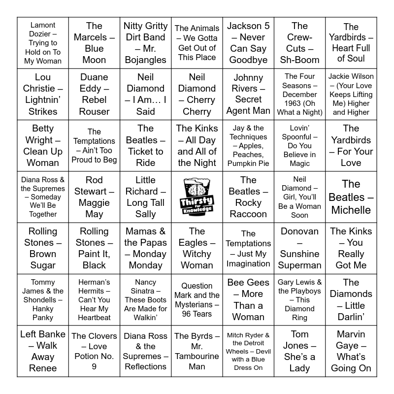 This bingo card has a free space and 100 words: Aretha Franklin – I Say a Little Prayer for You, Bee Gees – More Than a Woman, Betty Wright – Clean Up Woman, Billy Paul – Me and Mrs. Jones, Bob Dylan – Like a Rolling Stone, Bobby Day – Rockin’ Robin, Booker T. & the M.G.’s – Green Onions, Buffalo Springfield – For What It’s Worth, Carole King – I Feel the Earth Move, Cher – Gypsies, Tramps & Thieves, Cliff Richard – Devil Woman, Cream – Sunshine of Your Love, Diana Ross & the Supremes – Reflections, Diana Ross & the Supremes – Someday We’ll Be Together, Dobie Gray – Drift Away, Donovan – Sunshine Superman, Duane Eddy – Rebel Rouser, Electric Light Orchestra – Evil Woman, Electric Light Orchestra – Sweet Talkin’ Woman, Elvis Presley – That’s All Right, Four Tops – Bernadette, Four Tops – Reach Out I’ll Be There, Gary Lewis & the Playboys – This Diamond Ring, Guess Who – American Woman, Herman’s Hermits – Can’t You Hear My Heartbeat, Jackie Wilson – (Your Love Keeps Lifting Me) Higher and Higher, Jackson 5 – Never Can Say Goodbye, Jay & the Techniques – Apples, Peaches, Pumpkin Pie, Joe Tex – Ain’t Gonna Bump No More (With No Big Fat Woman), Johnny Cash – Cry! Cry! Cry!, Johnny Rivers – Secret Agent Man, Lamont Dozier – Trying to Hold on To My Woman, Led Zeppelin – Dazed and Confused, Left Banke – Walk Away Renee, Little Richard – Long Tall Sally, Lou Christie – Lightnin’ Strikes, Lovin’ Spoonful – Do You Believe in Magic, Lovin’ Spoonful – Summer in the City, Mamas & the Papas – Monday Monday, Marvin Gaye – What’s Going On, Mitch Ryder & the Detroit Wheels – Devil with a Blue Dress On, Nancy Sinatra – These Boots Are Made for Walkin’, Neil Diamond – Cherry Cherry, Neil Diamond – Girl, You’ll Be a Woman Soon, Neil Diamond – I Am… I Said, Nitty Gritty Dirt Band – Mr. Bojangles, Procol Harum – A Whiter Shade of Pale, Question Mark and the Mysterians – 96 Tears, Rare Earth – I Just Want to Celebrate, Rod Stewart – Maggie May, Rolling Stones – (I Can’t Get No) Satisfaction, Rolling Stones – Brown Sugar, Rolling Stones – Paint It, Black, Sam the Sham & The Pharaohs – Wooly Bully, Spencer Davis Group – Gimme Some Lovin’, Stevie Wonder – Boogie on Reggae Woman, Stevie Wonder – I Was Made to Love Her, Stevie Wonder – Uptight (Everything’s Alright), Surfaris – Wipe Out, The Animals – We Gotta Get Out of This Place, The Beach Boys – Sloop John B, The Beatles – A Hard Day’s Night, The Beatles – Can’t Buy Me Love, The Beatles – Eight Days a Week, The Beatles – Here Comes the Sun, The Beatles – I Am the Walrus, The Beatles – I Want to Hold Your Hand, The Beatles – Michelle, The Beatles – Nowhere Man, The Beatles – Penny Lane, The Beatles – Rocky Raccoon, The Beatles – Ticket to Ride, The Box Tops – Cry Like a Baby, The Box Tops – The Letter, The Byrds – Mr. Tambourine Man, The Clovers – Love Potion No. 9, The Cowsills – Indian Lake, The Crew-Cuts – Sh-Boom, The Diamonds – Little Darlin’, The Eagles – Witchy Woman, The Fleetwoods – Come Softly to Me, The Four Seasons – December 1963 (Oh What a Night), The Hollies – Bus Stop, The Kinks – All Day and All of the Night, The Kinks – You Really Got Me, The Marcels – Blue Moon, The McCoys – Hang on Sloopy, The Miracles – The Tracks of My Tears, The Stampeders – Sweet City Woman, The Temptations – Ain’t Too Proud to Beg, The Temptations – Just My Imagination, The Troggs – Wild Thing, The Turtles – Happy Together, The Yardbirds – For Your Love, The Yardbirds – Heart Full of Soul, Thurston Harris – Little Bitty Pretty One, Tom Jones – She’s a Lady, Tommy James & the Shondells – Hanky Panky, Tommy James & the Shondells – I Think We’re Alone Now and Young Rascals – Good Lovin’.