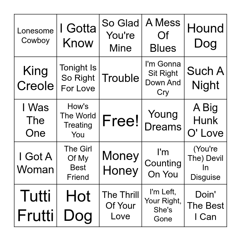 This bingo card has a free space and 102 words: Jailhouse Rock, Heartbreak Hotel, Hound Dog, Love Me Tender, All Shook Up, It's Now Or Never, Blue Suede Shoes, Don't Be Cruel, That's All Right Mama, Good Rockin' Tonight, (Let Me Be Your) Teddy Bear, Stuck On You, Mystery Train, Treat Me Nice, Fever, Too Much, I Got A Woman, Lawdy Miss Clawdy, Long Tall Sally, Maybelline, My Baby Left Me, Ready Teddy, Hearts Of Stone, Blue Moon Of Kentucky, Tweedle Dee, Such A Night, A Mess Of Blues, The Girl Of My Best Friend, (You're So Square) Baby I Don't Care, Dirty, Dirty Feeling, I Gotta Know, So Glad You're Mine, Have I told You Lately That I Love You, I Forgot To Remember To Forget, (Let's Have A) Party, Money Honey, I Don't Care If The Sun Don't Shine, Baby Let's Play House, I Was The One, I'm Left, Your Right, She's Gone, Blue Moon, Shake Rattle And Roll, Tutti Frutti, Like A Baby, Mean Woman Blues, Just Because, Milkcow Blues Boogie, I'm Gonna Sit Right Down And Cry, Make Me Know It, Rip It Up, G.I. Blues, Wooden Heart, King Creole, New Orleans, Big Boots, Shoppin' Around, Steadfast, Loyal, And True, Lover Doll, Danny, Doin' The Best I Can, Wear My Ring Around Your Neck, Any Place Is Paradice, Got A Lot O' Livin' To Do, Paralyzed, I Want To Be Free, Old Shep, Soldier Boy, A Big Hunk O' Love, How's The World Treating You, Hot Dog, Tell Me Why, One Night Of Sin, When It Rains, It Really Pours, I Beg Of You, Loving You, Frankfort Special, Tonight Is So Right For Love, Pocket Full Of Rainbows, Don't Ask Me Why, As Long As I Have You, What's She Really Like, Crawfish, Hard Headed Woman, Young Dreams, Dixieland Rock, Trouble, Tomorrow Night, The Girl Next Door Went A'Walkin', It Feels So Right, Reconsider Baby, First in Line, I'm Counting On You, On-Sided Love Affair, How Do You Think I Feel, When My Blue Moon Turns To Gold Again, The Thrill Of Your Love, Lonesome Cowboy, In The Ghetto, (You're The) Devil In Disguise, Kentucky Rain, Burning Love and He.