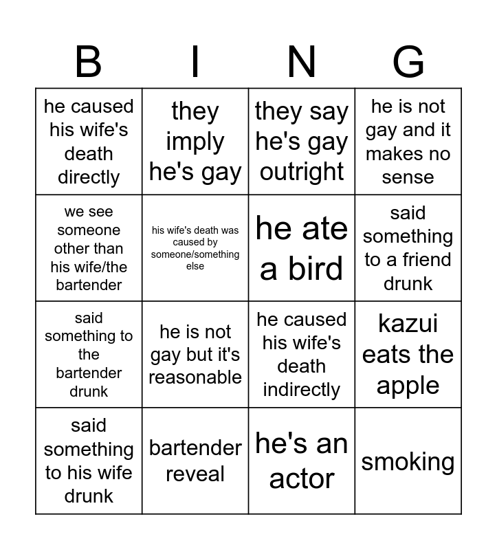 This bingo card has 16 words: bartender reveal, kazui eats the apple, they say he's gay outright, he caused his wife's death directly, said something to the bartender drunk, they imply he's gay, he caused his wife's death indirectly, he's an actor, we see someone other than his wife/the bartender, his wife's death was caused by someone/something else, said something to his wife drunk, he is not gay and it makes no sense, he is not gay but it's reasonable, said something to a friend drunk, he ate a bird and smoking.