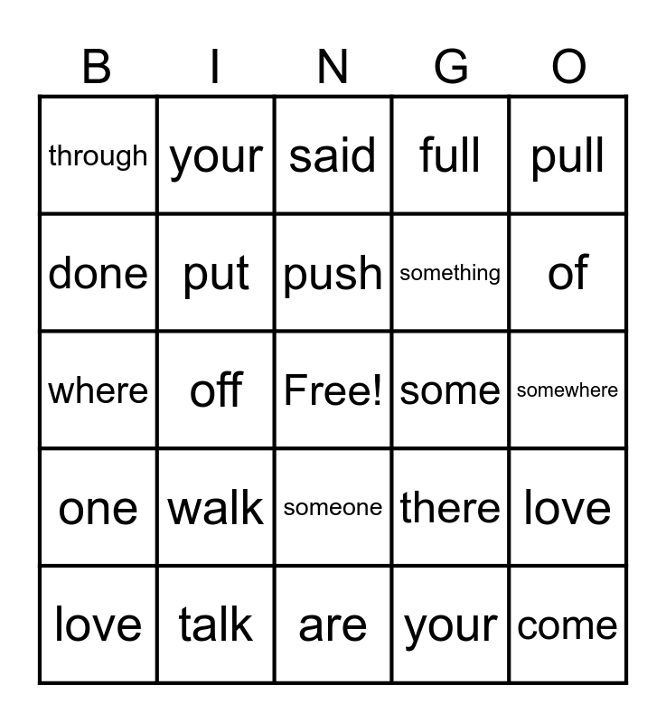 This bingo card has a free space and 24 words: walk, talk, push, love, pull, through, done, your, some, someone, something, where, there, love, put, your, somewhere, said, of, off, come, one, full and are.
