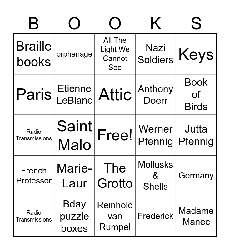 This bingo card has a free space and 29 words: Radio Transmissions, Sea of flames, Saint Malo, Canned peaches, Braille books, All The Light We Cannot See, Etienne LeBlanc, Marie-Laur, Werner Pfennig, Bday puzzle boxes, Jutta Pfennig, Madame Manec, Reinhold van Rumpel, Frederick, Book of Birds, "Alive before you die, The Grotto, French Professor, Keys, Radio Transmissions, Mollusks & Shells, Un Pain Ordinaire, Anthony Doerr, Paris, Nazi Soldiers, orphanage, Germany, Attic and Bombing.