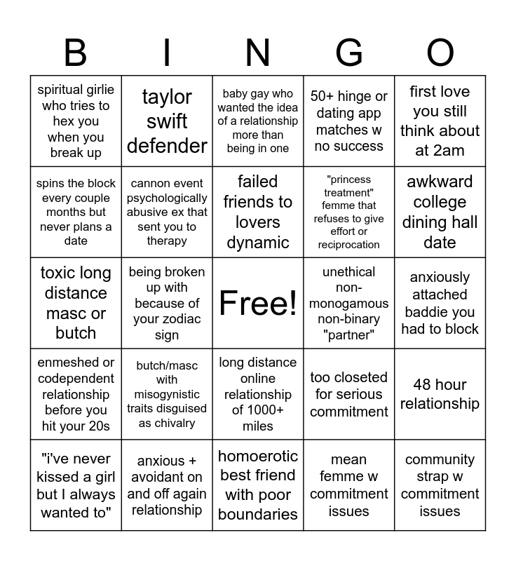 This bingo card has a free space and 24 words: butch/masc with misogynistic traits disguised as chivalry, anxious + avoidant on and off again relationship, failed friends to lovers dynamic, "i've never kissed a girl but I always wanted to", first love you still think about at 2am, spiritual girlie who tries to hex you when you break up, spins the block every couple months but never plans a date, taylor swift defender, unethical non-monogamous non-binary "partner", long distance online relationship of 1000+ miles, "princess treatment" femme that refuses to give effort or reciprocation, toxic long distance masc or butch, too closeted for serious commitment, 48 hour relationship, cannon event psychologically abusive ex that sent you to therapy, mean femme w commitment issues, anxiously attached baddie you had to block, baby gay who wanted the idea of a relationship more than being in one, awkward college dining hall date, being broken up with because of your zodiac sign, community strap w commitment issues, enmeshed or codependent relationship before you hit your 20s, 50+ hinge or dating app matches w no success and homoerotic best friend with poor boundaries.