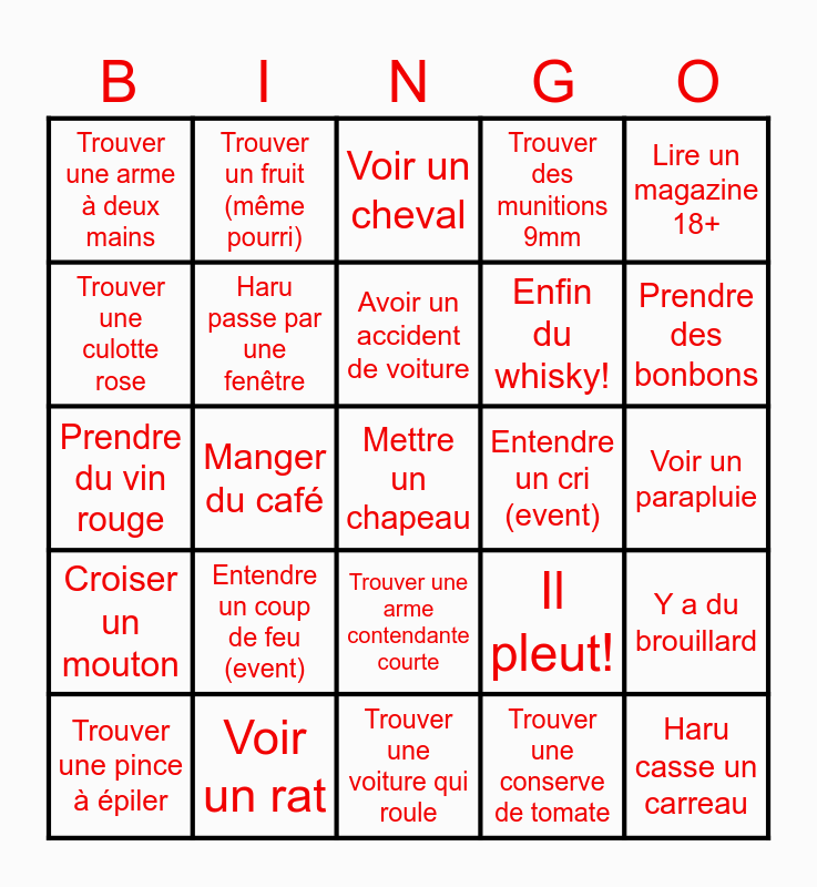 This bingo card has 26 words: Trouver une arme contendante courte, Trouver une conserve de tomate, Avoir un accident de voiture, Voir un rat, Lire un magazine 18+, Trouver une arme à deux mains, Trouver une culotte rose, Trouver un fruit (même pourri), Voir un parapluie, Il pleut!, Enfin du whisky!, Prendre du vin rouge, Y a du brouillard, Trouver une pince à épiler, Manger du café, C'est une voiture de police, Trouver des munitions 9mm, Croiser un mouton, Voir un cheval, Mettre un chapeau, Prendre des bonbons, Trouver une voiture qui roule, Entendre un cri (event), Entendre un coup de feu (event), Haru passe par une fenêtre and Haru casse un carreau.