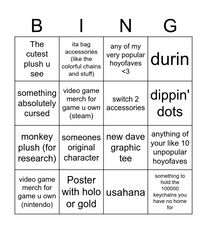 This bingo card has 16 words: Poster with holo or gold, anything of your like 10 unpopular hoyofaves, any of my very popular hoyofaves <3, The cutest plush u see, monkey plush (for research), ita bag accessories (like the colorful chains and stuff), new dave graphic tee, usahana, something absolutely cursed, video game merch for game u own (steam), video game merch for game u own (nintendo), durin, someones original character, dippin' dots, switch 2 accessories and something to hold the 100000 keychains you have no home for.
