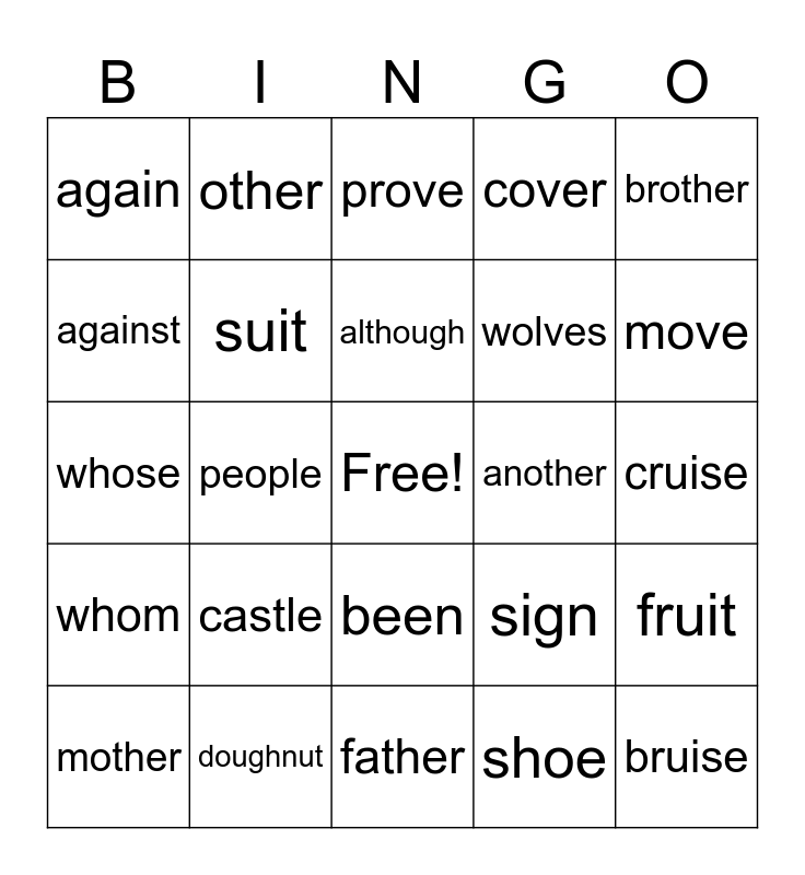 This bingo card has a free space and 24 words: castle, doughnut, although, mother, brother, again, against, other, another, been, wolves, whose, sign, fruit, suit, shoe, cruise, prove, move, people, bruise, whom, cover and father.