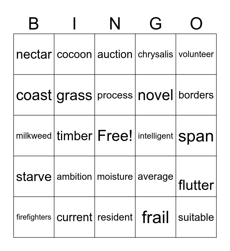 This bingo card has a free space and 24 words: ambition, current, process, firefighters, volunteer, nectar, coast, cocoon, intelligent, moisture, novel, milkweed, average, flutter, grass, frail, span, auction, borders, timber, suitable, starve, chrysalis and resident.