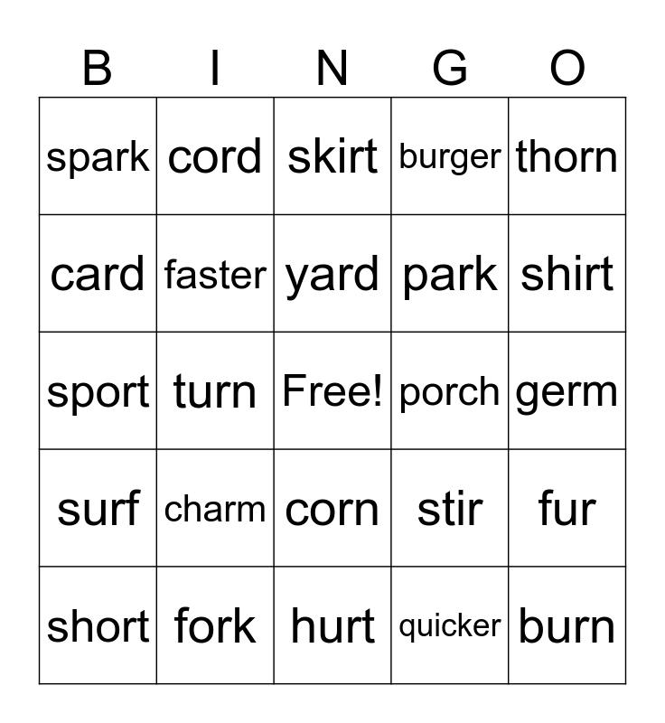 This bingo card has a free space and 24 words: charm, fork, yard, short, thorn, spark, card, cord, porch, corn, park, sport, stir, fur, faster, quicker, germ, skirt, shirt, turn, burn, surf, burger and hurt.
