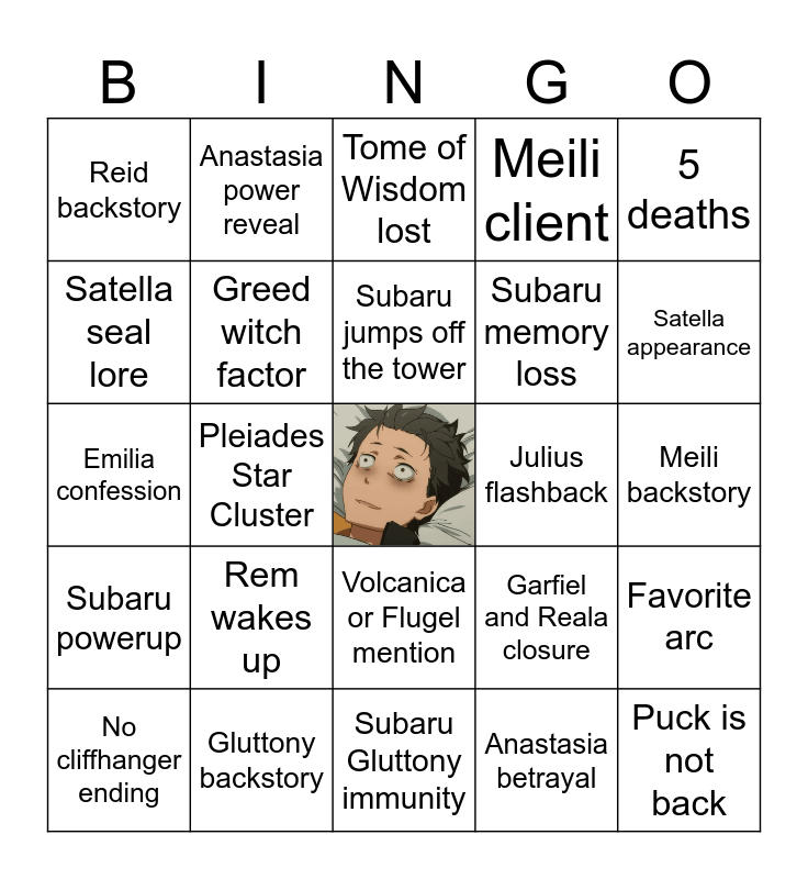 This bingo card has a free space and 24 words: Rem wakes up, Gluttony backstory, Subaru jumps off the tower, No cliffhanger ending, 5 deaths, Reid backstory, Satella seal lore, Anastasia power reveal, Julius flashback, Volcanica or Flugel mention, Subaru memory loss, Emilia confession, Garfiel and Reala closure, Favorite arc, Greed witch factor, Anastasia betrayal, Meili backstory, Tome of Wisdom lost, Satella appearance, Pleiades Star Cluster, Puck is not back, Subaru powerup, Meili client and Subaru Gluttony immunity.