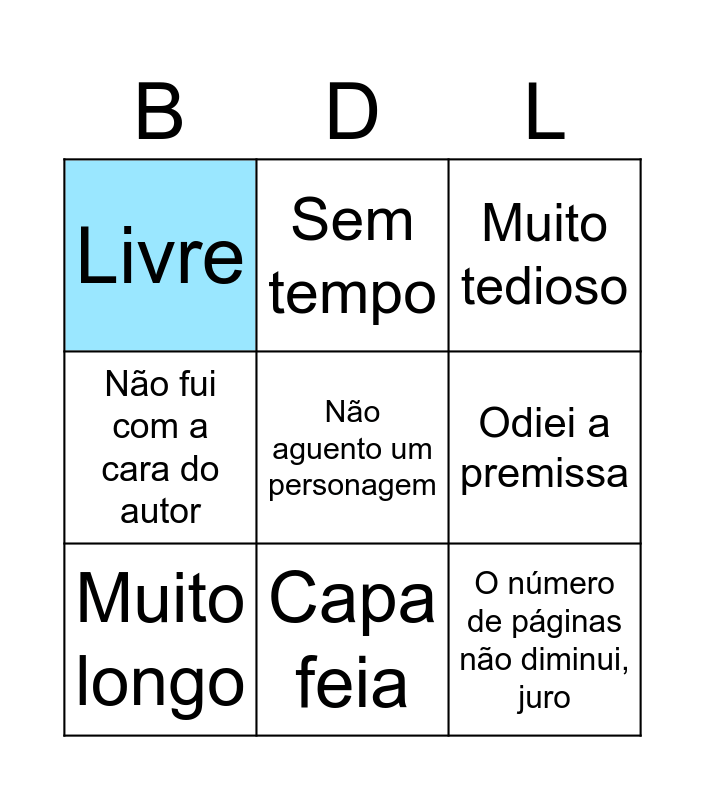 This bingo card has 9 words: Muito longo, Muito tedioso, Sem tempo, Não fui com a cara do autor, Livre, Odiei a premissa, Não aguento um personagem, O número de páginas não diminui, juro and Capa feia.
