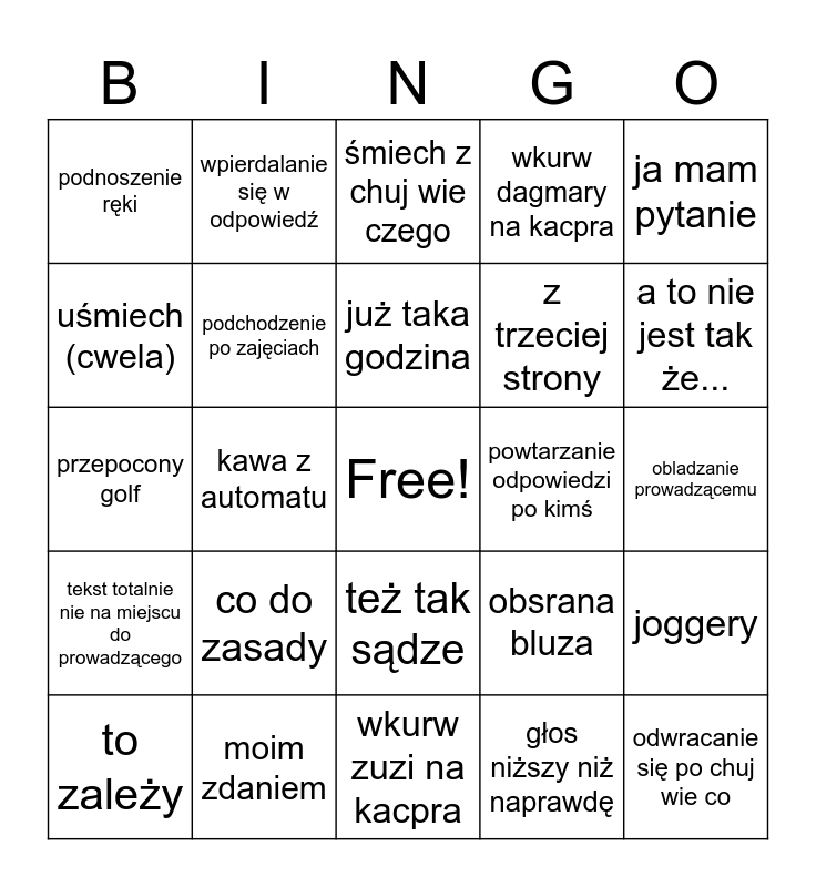 This bingo card has a free space and 24 words: co do zasady, moim zdaniem, już taka godzina, to zależy, ja mam pytanie, podnoszenie ręki, uśmiech (cwela), wpierdalanie się w odpowiedź, powtarzanie odpowiedzi po kimś, też tak sądze, z trzeciej strony, przepocony golf, obsrana bluza, joggery, podchodzenie po zajęciach, głos niższy niż naprawdę, obladzanie prowadzącemu, śmiech z chuj wie czego, a to nie jest tak że..., kawa z automatu, odwracanie się po chuj wie co, tekst totalnie nie na miejscu do prowadzącego, wkurw dagmary na kacpra and wkurw zuzi na kacpra.