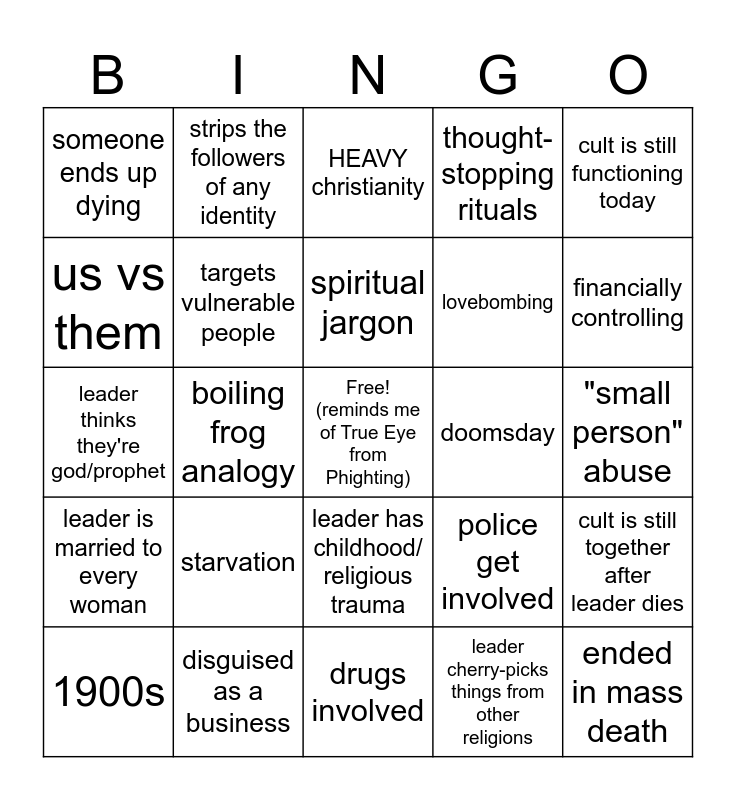 This bingo card has a free space and 29 words: 1900s, charismatic leader, boiling frog analogy, sleep deprivation, someone ends up dying, HEAVY christianity, targets vulnerable people, starvation, doomsday, disguised as a business, "small person" abuse, ended in mass death, drugs involved, leader cherry-picks things from other religions, financially controlling, SA, leader has childhood/ religious trauma, leader is married to every woman, cult is still functioning today, leader thinks they're god/prophet, police get involved, followers leave everything behind for cult, lovebombing, us vs them, thought-stopping rituals, strips the followers of any identity, cult is still together after leader dies, spiritual jargon and isolation.